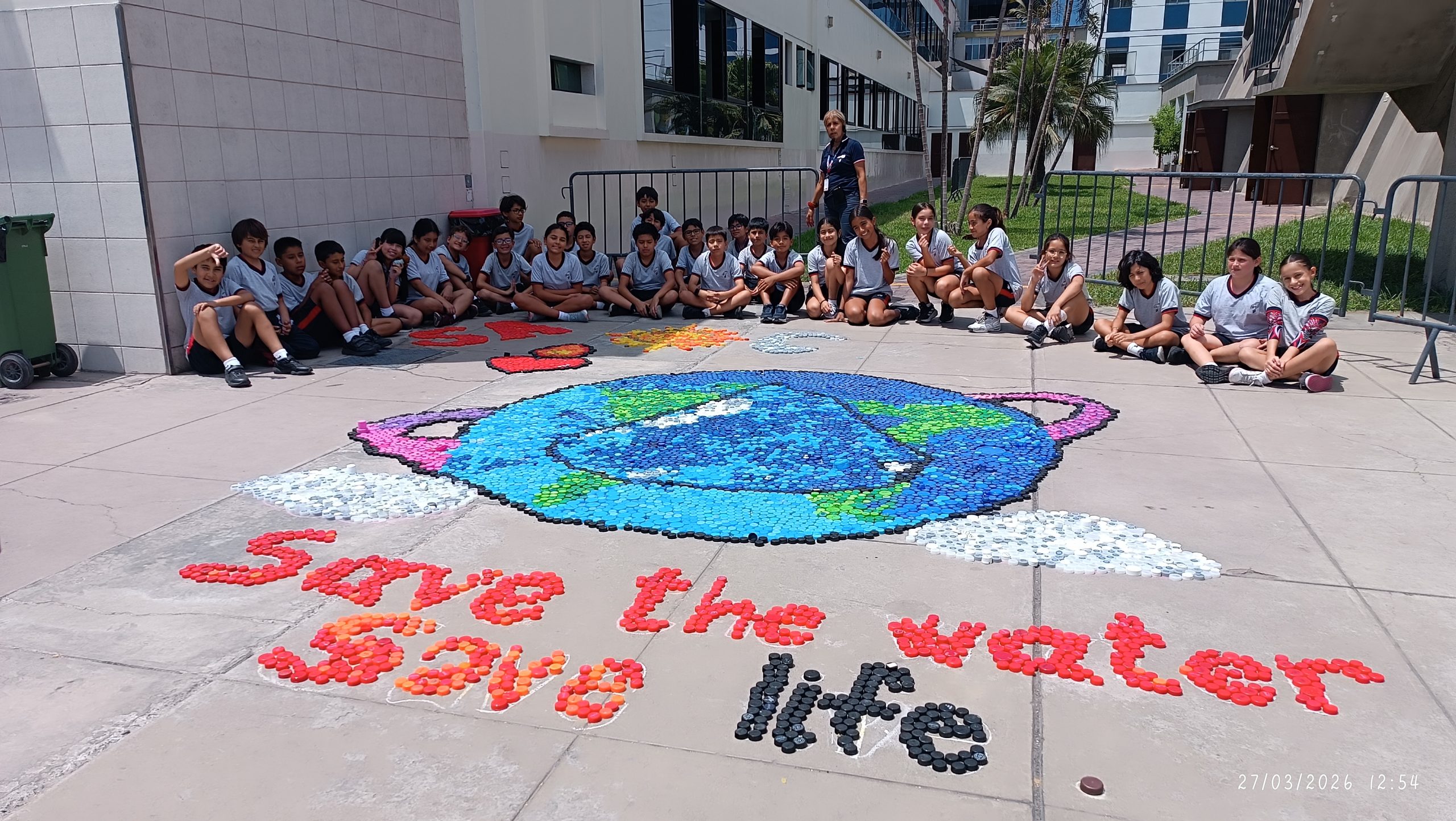The highlight of the celebration was the creation of a vibrant “bottle caps carpet,” carefully assembled next to the school chapel. With guidance from their Science teachers and many more members of the school community, students used the colorful caps to design patterns and shapes that symbolized water, life, and unity. The final piece was not only visually striking but also carried a powerful message about teamwork and environmental awareness.